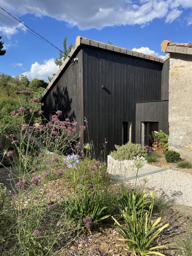Création d’une extension contemporaine en bardage bois sur une maison en pierres. L’objectif principal était de repenser la distribution des espaces de cette bâtisse, en y intégrant une suite parentale avec salle de bain privée, ainsi qu’un hall d’entrée spacieux et fonctionnel. Les aménagements extérieurs ont dû être soigneusement repensé, avec la réalisation d’un parking, la gestion des accès autour de l’extension, et la création de massifs végétalisés, afin de valoriser l’ensemble de la propriété.